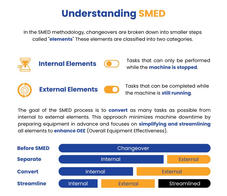 This involves separating internal and external setup tasks, utilizing quick-change tooling systems, and training operators on efficient changeover techniques.